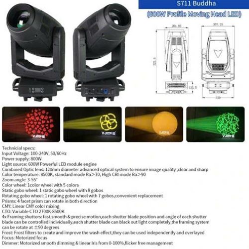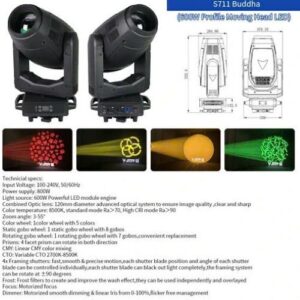 S711 thiết lập chùm sáng, điểm, rửa và cắt chức năng trong một, màu sắc tinh khiết, điểm đồng đều, tấm màu, tấm gobo thủy tinh, CTO, tấm CRI là vật liệu schott, ngoại hình nhỏ, trọng lượng nhẹ, đế của nó nhỏ và tinh tế, giúp giảm trọng lượng của đèn, hệ thống trộn màu CMY tuyến tính, Cung cấp độ bão hòa màu sắc phong phú và chuyển đổi màu sắc liền mạch rõ ràng. Đèn LED sử dụng động cơ đèn LED đơn sắc 600W tiết kiệm năng lượng và thân thiện với môi trường, có thể tạo ra ánh sáng trắng công suất cực cao, nhiệt độ màu 8000K, thông lượng ánh sáng của nguồn sáng lên đến 34.000lm.